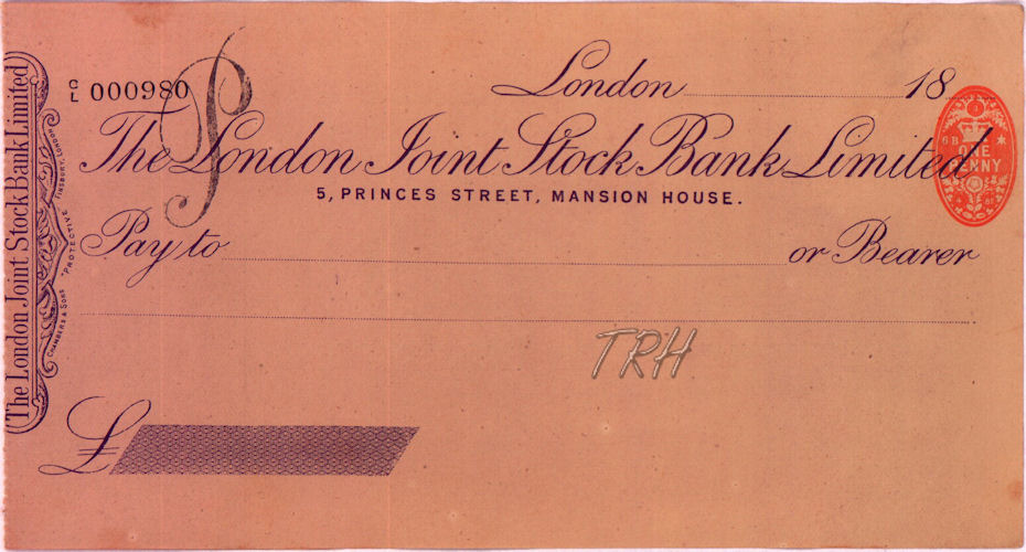 Cheque issued by London Joint Stock Bank