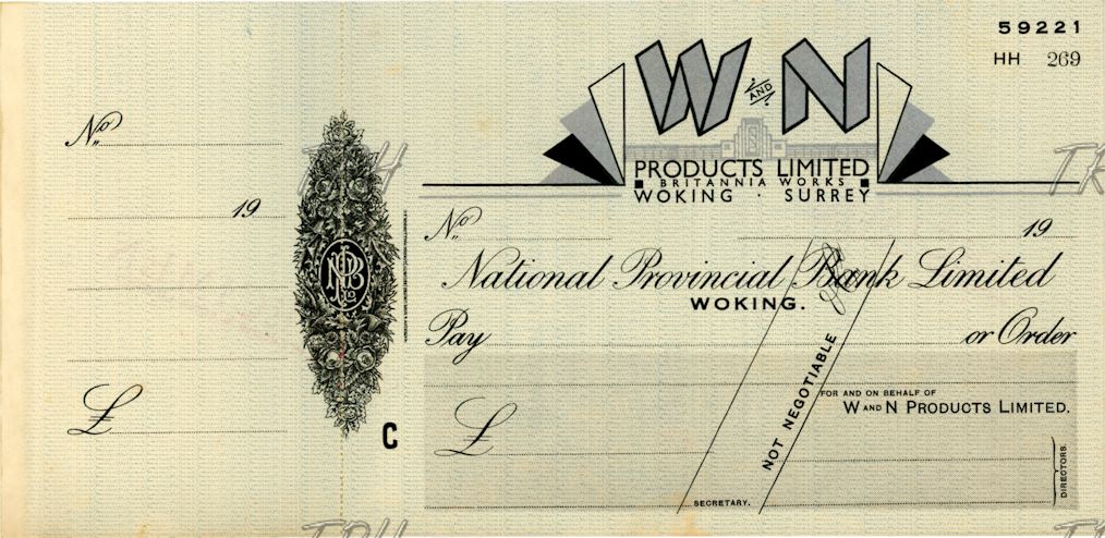 Cheque issued by National Provincial Bank, bespoke for W & N Products Ltd