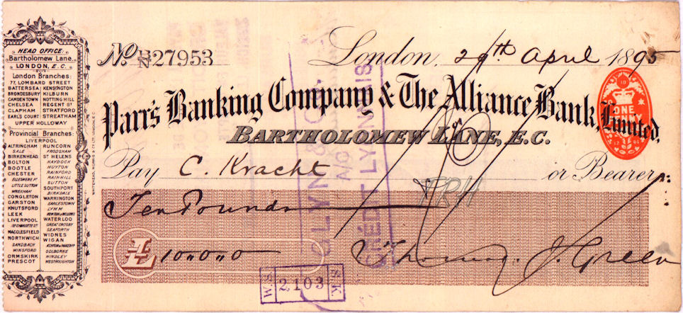 Cheque issued by Parr's Banking Company & The Alliance Bank Ltd