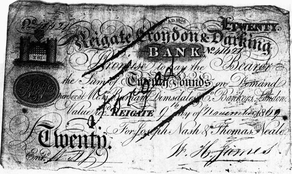 Reigate Bank was started in 1808 by the partnership of Israel Piper, Thomas Gale, Joseph Nash & Thomas Neale.