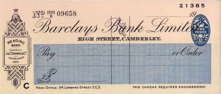 Cheque issued by the Camberley branch of Barclays Bank, showing its roots back to Simonds Bank